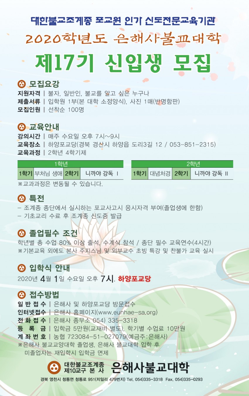 2020학년도 은해사 불교대학 17기 신입생 모집안내