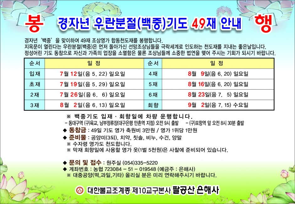 경자년 우란분절(백중)기도 49재 안내